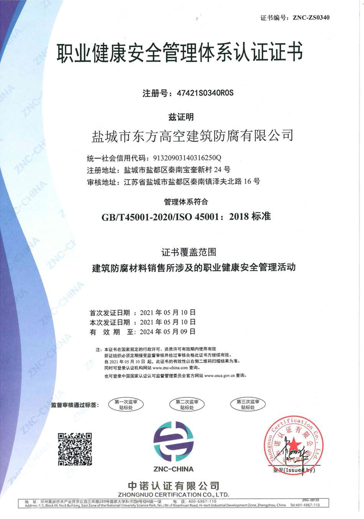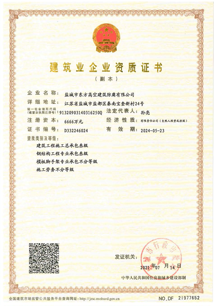 鹽城市東方高空建筑防腐有限公司地處于“東方濕地之都”,“鶴鹿之 鄉”,“高空作業之鄉”的江蘇省鹽城市。公司成立于90年代初期。是國家 批準成立的專業高空作業企業:承攬過(國內、國外)高空安裝、高空防 腐、煙囪防腐、鋼結構防腐、高空維修、煙囪維修、煙囪新建、高空清洗、 鈦鋼煙囪制作安裝、玻璃鋼煙囪制作安裝、冷卻塔防腐維修、高聳建筑物美 化亮化、防水堵漏等高空作業工程。公司外出施工人員都經過江蘇省勞動部 門的嚴格培訓...