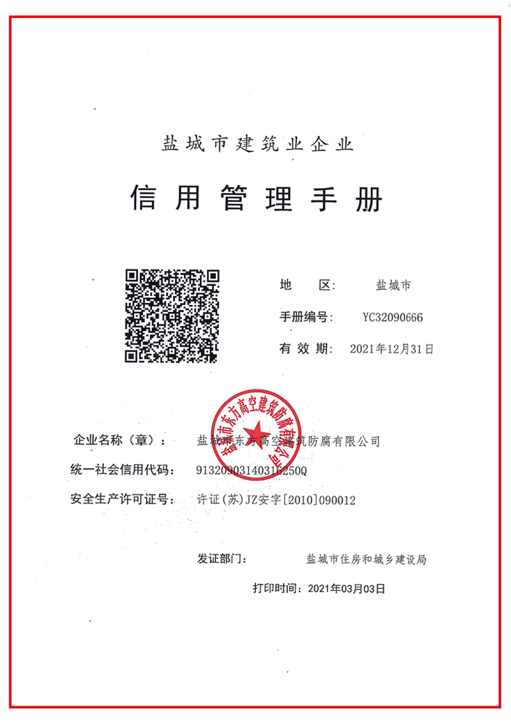 多年來,公司榮獲了江蘇省建筑業協會“最佳企業”江蘇省建設委員會頒發的“文明建設先進單位 ”同年經中國建設公司江蘇省分行企業資信等級評定委員會評為“省特級”企業;被鹽城市人民政府評為“重合同、守信用”企業;被國家化學工業部評為化工防腐一級企業,頒發了“中國防腐蝕施工一級資質證書”。